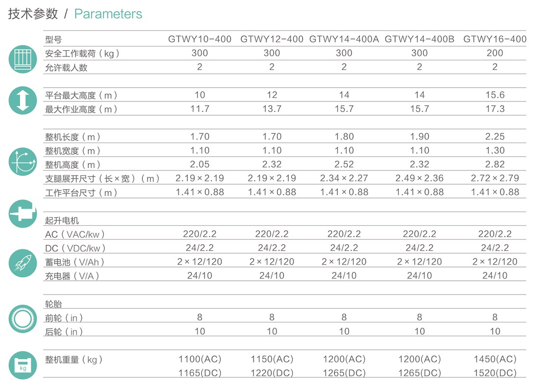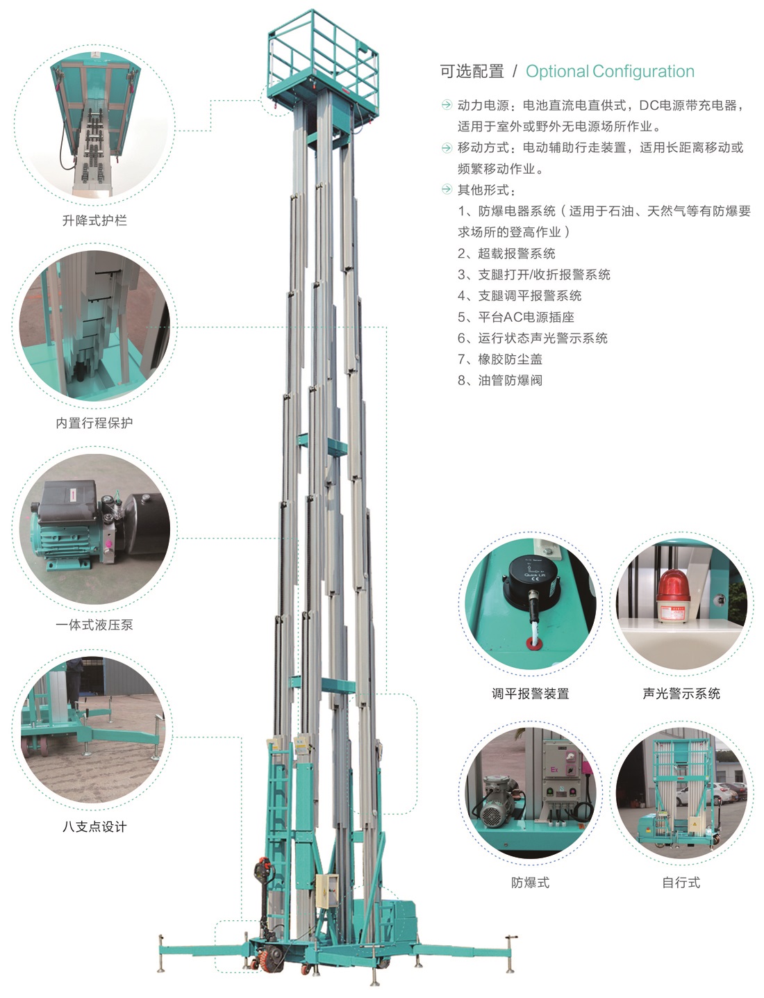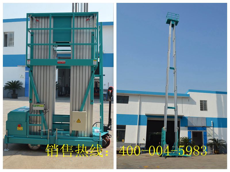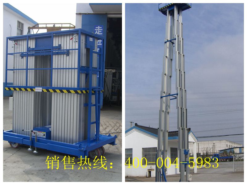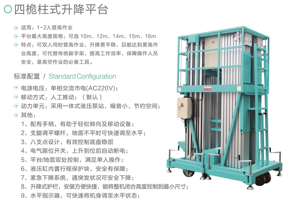 平臺最大高度規格:可選 10m、12m、14m、15m、16m特點:可雙人同時登高作業,升降更平穩,且能達到更高作業高度,可代替傳統腳手架,提高工作效率,保障操作人員安全,是高空作業的必備工具。